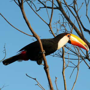 Le toucan toco n'est pas un oiseau farouche et va jusqu'à entrer dans les maisons pour y dérober de la nourriture sans se soucier des chiens.